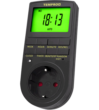 De TemPro digitale tijdklok heeft een groot led-scherm aan de voorkant. Net onder de bedieningsknop zitten zes knoppen die eenvoudige programmering mogelijk maken. Opvallend is de modusknop, met drie gebruiksmodi Aan, Auto en Uit, waarmee je de modus van de timer kunt kiezen. En de Timer-knop, waarmee je tot 8 intervallen kunt selecteren, met een minimum van 1 minuut bediening.